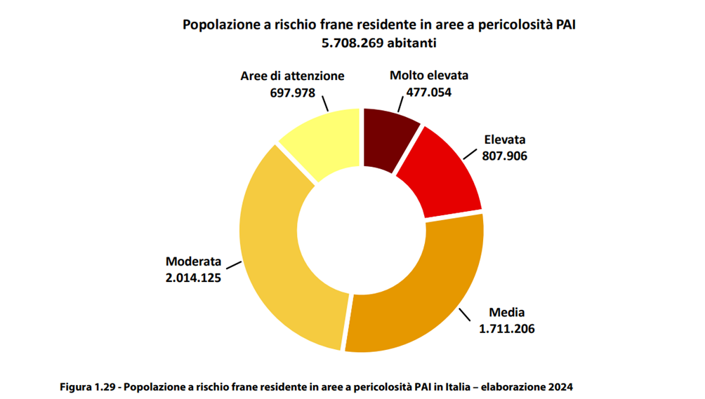 In Italia, l’emergenza idrogeologica è una questione strutturale e antica, collegata alle caratteristiche morfologiche, climatiche e di gestione del territorio (coltivazione, urbanizzazione, ecc.) tipiche del nostro Paese. Fenomeni quali le frane, le valanghe, le alluvioni, le esondazioni dei fiumi, o, infine, l’erosione delle coste, possono produrre gravi effetti al suolo, con conseguenze critiche per la popolazione e per l’ambiente. La vulnerabilità del territorio è un fatto assodato: secondo il rapporto “Dissesto idrogeologico in Italia: pericolosità e indicatori di rischio”, di ISPRA - Istituto Superiore per la Protezione e la Ricerca Ambientale, il 94,5% dei comuni italiani è a rischio per emergenze idrogeologiche. Solo per quanto riguarda i fenomeni franosi, il grafico mostra il numero di residenti in Italia esposti a rischio secondo il PAI – Piano di Assetto Idrogeologico.