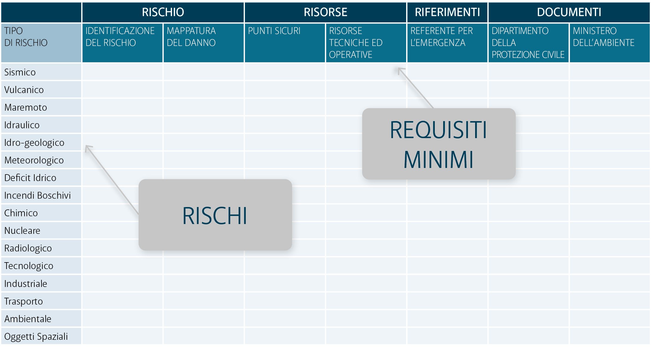 La Griglia dei Requisiti Minimi è la classificazione dei rischi esistenti sul territorio e delle risorse necessarie per fronteggiarli. Viene utilizzata nei Piani di Emergenza della Protezione Civile a diversi livelli (Comune, Provincia, ecc.), per verificare se un territorio dispone del minimo indispensabile per affrontare le situazioni di rischio, gestire le prime fasi dell’emergenza e coordinare gli interventi con tutti gli enti coinvolti. La Griglia dei Requisiti Minimi risponde a 3 domande fondamentali: